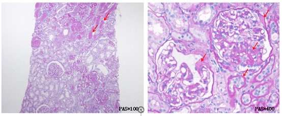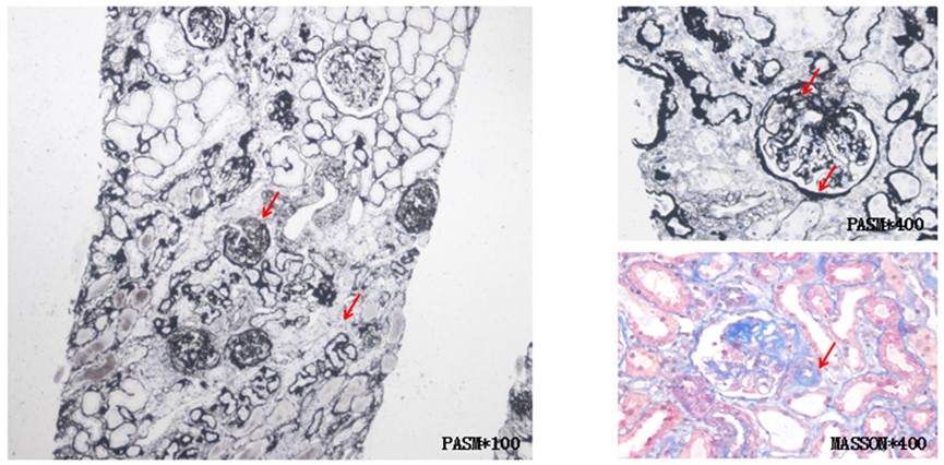 图1.光镜检查。可见缺血性硬化伴肾小管多灶性萎缩,节段性硬化伴玻璃滴样病变及间质纤维化。