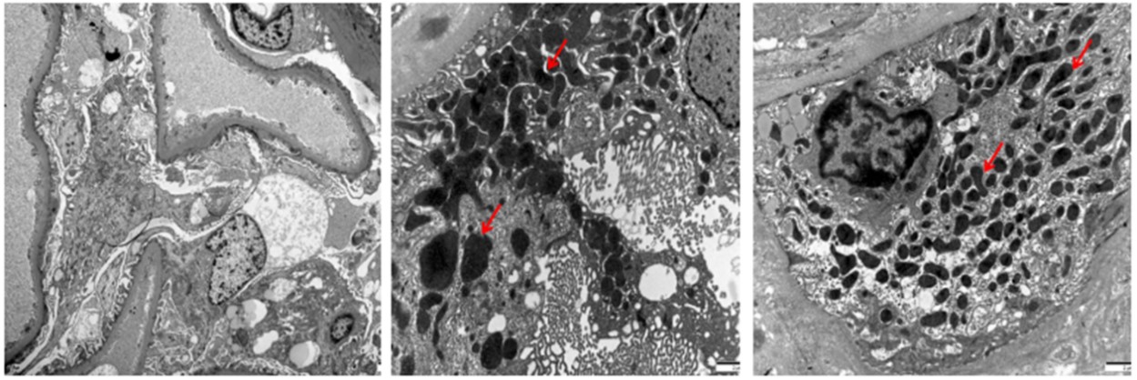 图3.肾组织电镜分析(×4000)。可见足突节段性融合及形态异常的线粒体。可见系膜基质轻度增多,但肾小球基底膜未见明显改变。
