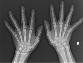 入院后辅助化验检查:血常规+网织红细胞计数:血红蛋白101.00g/L,网织红细胞比率4.20%,网织红细胞绝对计数137.30*109/L;肝功生化血脂:谷氨酰转酞酶180U/L,碱性磷酸酶751U/L,腺苷脱氨酶117.80U/L,前白蛋白355mg/L,总白蛋白26.6g/L;尿素13.9mmol/L,肌酐519.90μmol/L,肾小球滤过率7.62,尿酸143μmol/L,钙1.91mmol/L,乳酸脱氢酶316.70U/L;甘油三酯1.75mmol/L,同型半胱氨酸33.20μmol/L;贫血指标六项:内因子抗体1.25AU/ml,总铁结合力49.70μmol/L;甲状旁腺素835.00pg/ml;凝血五项:D-二聚体5.49mg/L,纤维蛋白(原)降解产物16.56μg/ml,纤维蛋白原4.72g/L;PRO-BNP:1876.00pg/ml。病毒定量+梅毒抗体、粪便常规+沉渣+隐血未见异常。腹部超声:双肾萎缩,呈弧形强回声改变。上肢血管超声:右前臂桡动脉-头静脉造瘘术后。心脏超声、眼科检查未见明显异常。双手DR正斜位(图B):双手骨质改变,结合病史,考虑肾性骨病(骨膜下骨吸收)。