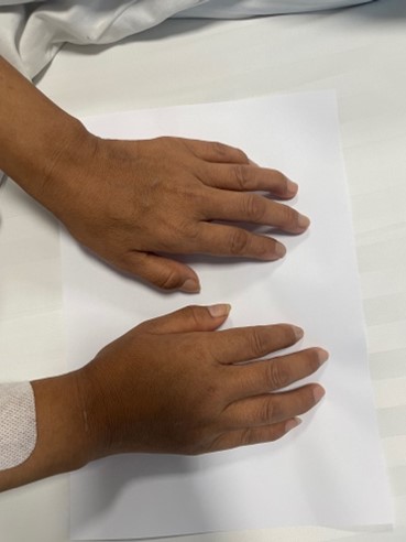 2025.07.03-07.12行硫代硫酸钠3.2g/d*10d静滴,治疗约1周后后患者双手关节可背伸(图I),双手及右下肢麻木疼痛消失,各关节疼痛明显减轻。