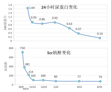 治疗半年后,肾功能:血肌酐74μmol/L、尿蛋白定量0.14g/24h,血常规等指标恢复正常,下肢血管彩超正常。
