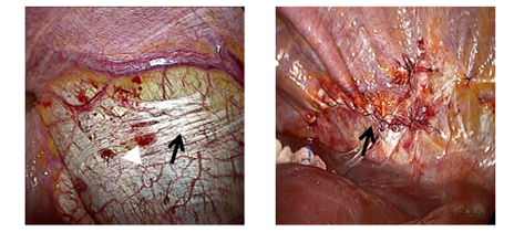胸腹瘘的治疗主要分为非手术治疗和手术治疗;常见的非手术治疗包括:更改腹膜透析方式,主要采取小剂量间歇性腹膜透析;改为血液透析治疗;少部分可考虑胸膜腔化学粘连法。手术治疗包括开胸手术、开腹手术、胸腔镜手术和腹腔镜手术[6]。传统治疗依赖开胸或开腹手术,创伤大、恢复慢,且易增加感染风险,让本就虚弱的肾病患者面临更大挑战。目前,微创手术修复已成为主流治疗方式,但腹腔镜与胸腔镜的选择仍存有争议。1996年,首次报道了胸腔镜手术(VATS)用于胸腹瘘的治疗,在21例确诊病例中成功率达到89%。然而,VATS仍有28%的病例未能检测到膈肌瘘,这些病例的治疗有效率仅为38%[7]。值得注意的是,高达50%的胸腹瘘病例在VATS评估中未能检测到膈肌瘘,这凸显了提高诊断准确性的必要性。近期文献建议,VATS联合腹腔镜手术是胸腹瘘的首选手术方法,以提高检测效果和治疗效率。与文献报道不同,本中心是以腹腔镜下内部修补方式为主,国内外开展较少,大大减少了患者术中风险及术后并发症[8]。