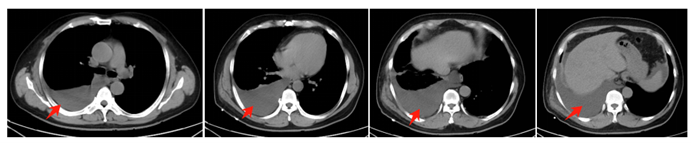 入院后完善相关实验室检查:生化检验报告:钾5.06mmol/L,钠129.8mmol/L,尿素氮22.06mmol/L,肌酐945.1umol/L,葡萄糖7.00mmol/L,肾小球滤过率7.1ml/min。血脂9项,肝功14项检验报告:高密度脂蛋白胆固醇1.13mmol/L,载脂蛋白A1 0.99g/L,总蛋白65.3g/l,白蛋白38.7g/L,谷丙转氨34U/L,谷草转氨酶38U/L。B型钠尿肽前体121.0ng/L,肌钙蛋白I <0.010ng/ml。血图分析1检验报告:血红蛋白116g/L,中性粒细胞68.6%,淋巴细胞百分比19.8%。糖化血红蛋白5.6%。尿液检查:尿蛋白(2+),尿隐血(2+),白细胞(-)。临检(粪便寄生虫检查,粪便检查2(常规+真菌),粪便隐血)检验报告:粪便隐血 弱阳性。胸部CT检查结果:右侧大量胸腔积液(图1)。